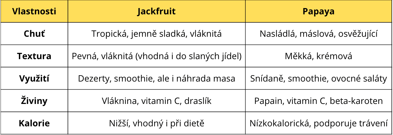 Jackfruit je ideální, pokud hledáte syté a výživné jídlo, které zasytí i bez masa. Papája zase kraluje svěžesti, lehkosti a podpoře trávení. Hlavní rozdíly jsme shrnuli do následující tabulky: